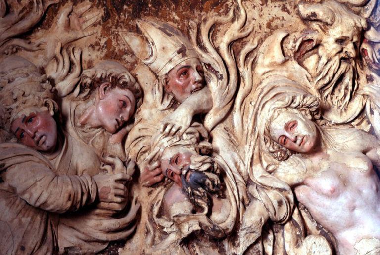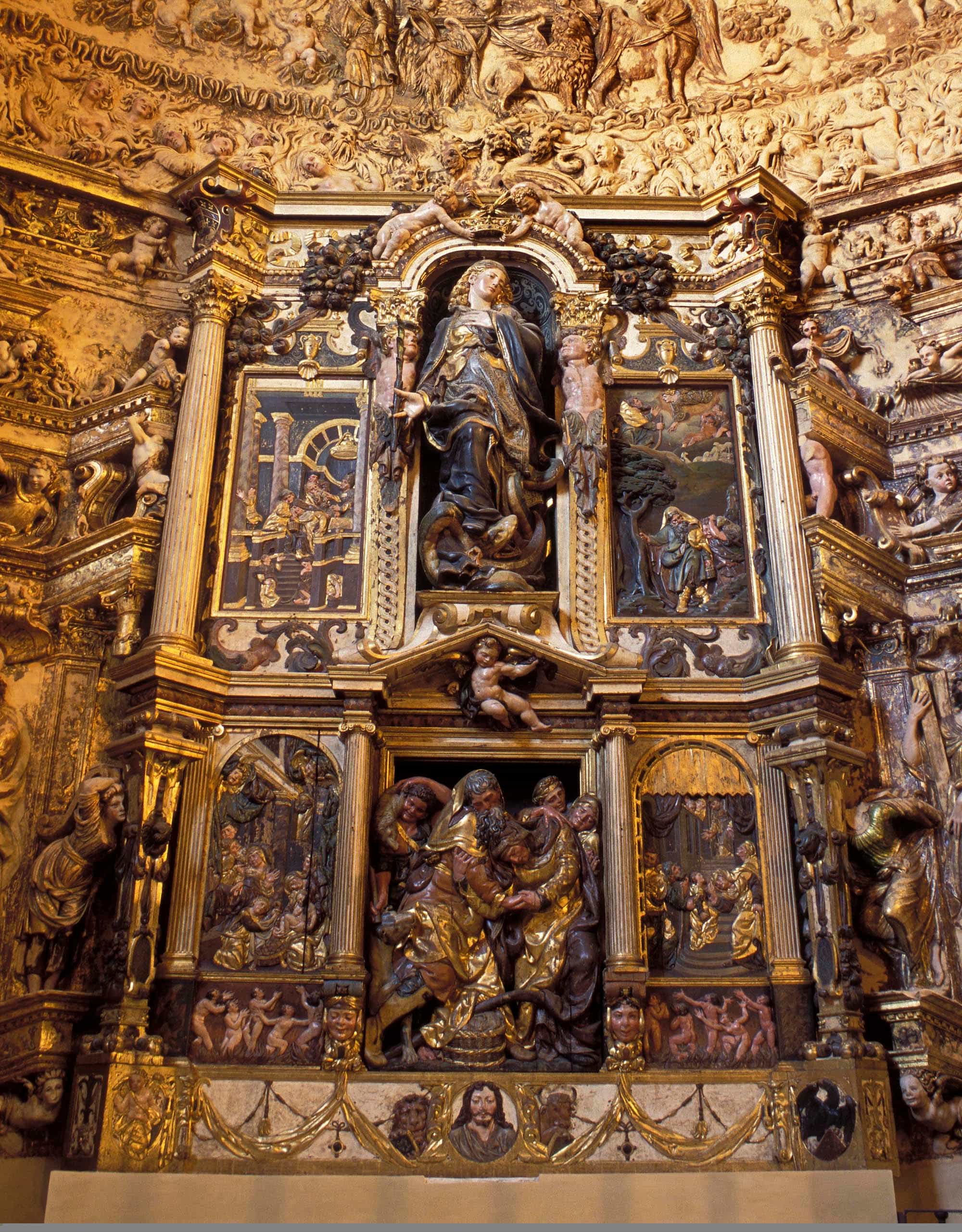 El magnífico retablo manierista es obra de Juan de Juni y narra la historia de la Virgen en cinco bajorrelieves.