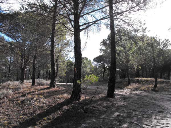 Continuamos la senda siguiendo las señales de PR® y alcanzamos el atril informativo del "Mirador Carramonte", con vistas hacia el Valle Arenosa y pico Transmorisco. Se sigue por camino serpenteante, llano y de amplia traza hasta el km 3,68, donde girando en dirección sur se llega a la derivación marcada como "Pino Pinilla". Es interesante la visita a este ejemplar de pino piñonero (Pinus Pinea), situado sobre un curioso lapiaz calizo y acompañado de jóvenes sabinas.